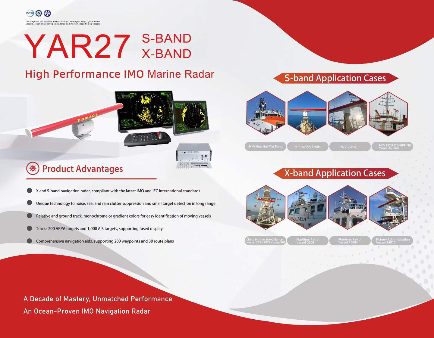 • 郑和系列(YAR27)IMO 船用 ARPA 雷达:具有S、X波段型号,符合最新 IMO/IEC 国际规范,获 CCS、欧盟 MED B+D 认证,具备超强海杂波抑制与 ARPA 避碰能力,适配商船、公务船等大型船舶,堪称远洋航行的 “安全之眼”。